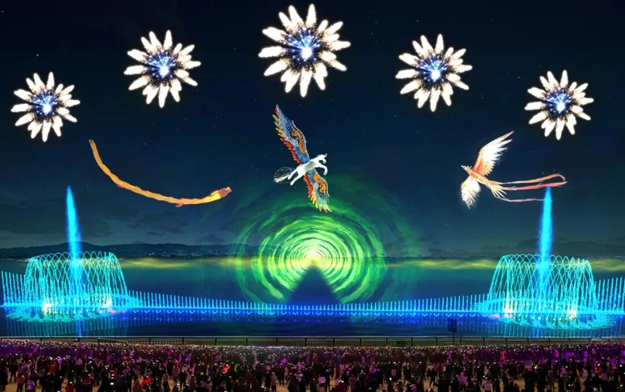 每晚核心演出时间为19:25—20:10。非遗飞龙、飞马、飞凤在湖面激光喷泉交织水幕,与焰火、无人机三重呼应,传统非遗+现代科技氛围感直接拉满。