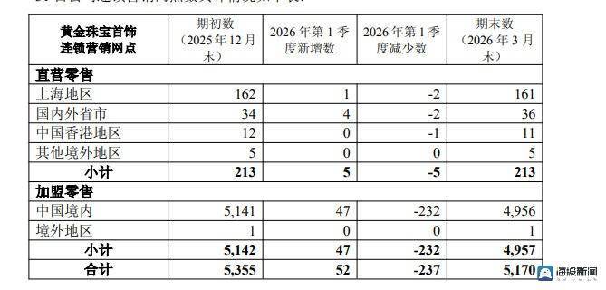 截至2026年3月末,老凤祥共计拥有连锁营销网点5,170家,较2025年末净减少185家,渠道进入结构优化期。
