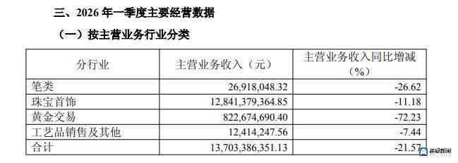 2026年一季度,老凤祥实现总营收137.03亿元,同比下滑21.57%。