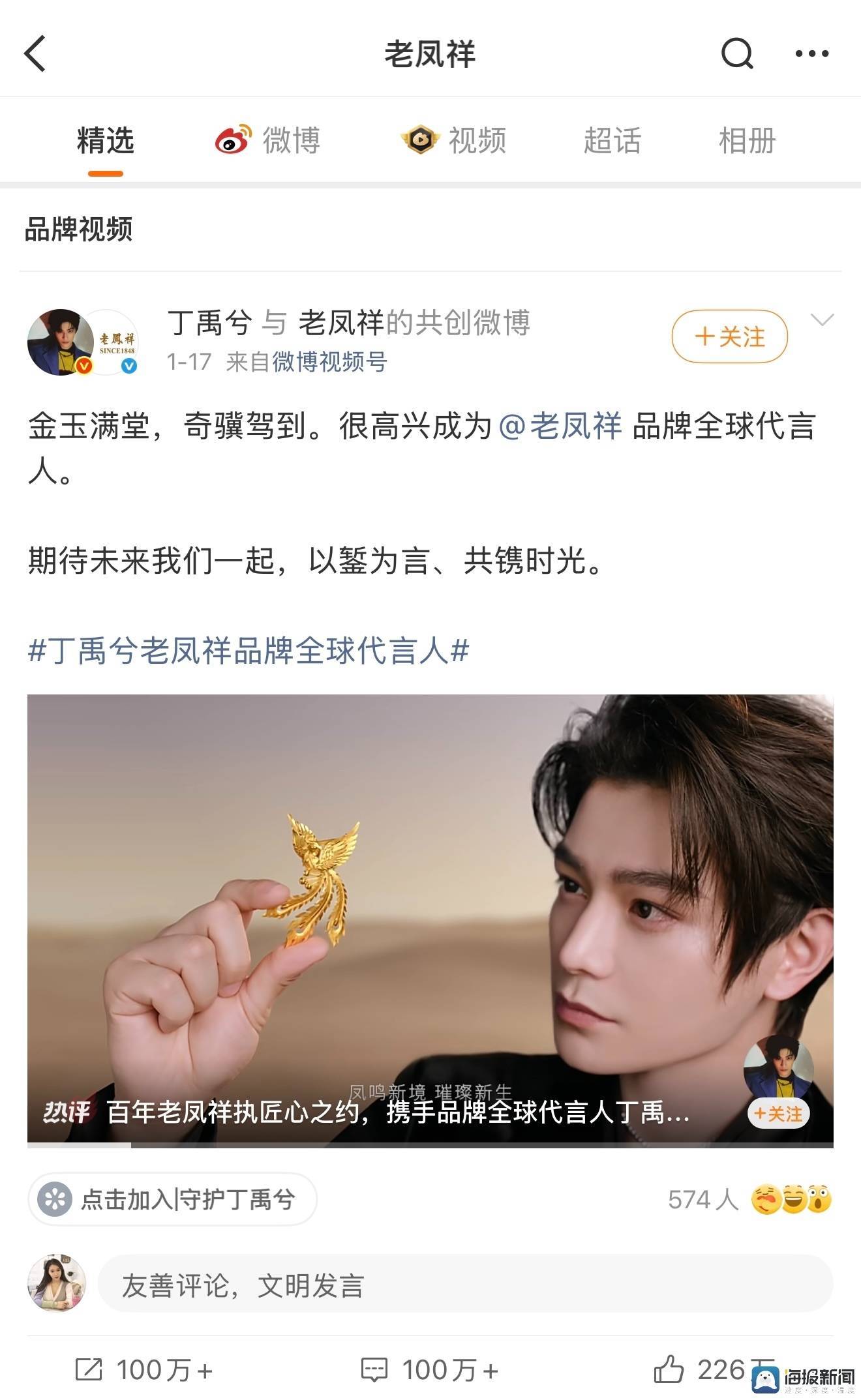 老凤祥官方微博显示,其官宣代言人的消息热度高,被转发评论均大于100万条,点赞超226万次。