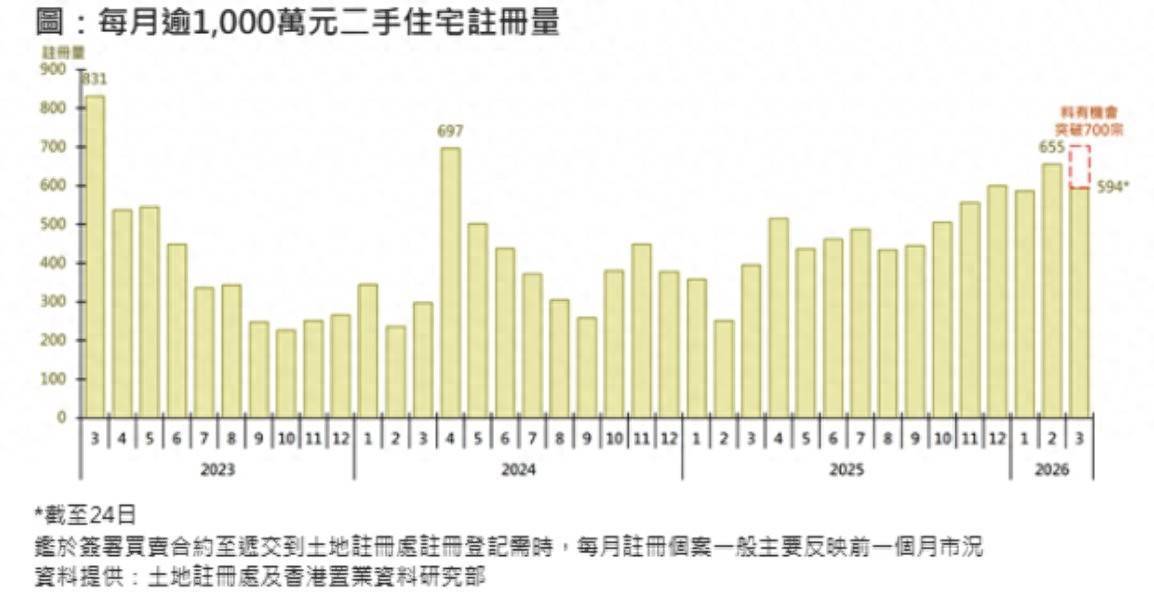 智通财经APP获悉,香港置业研究部董事王品弟表示,据土地注册处资料显示,本月至今(截至24日)逾1,000万元(港元,下同)二手住宅录594宗注册,较上月同期的506宗增加约17.4%;若以目前注册进度推算,料3月全月有机会突破700宗,届时将创36个月(即3年)新高。鉴于签署买卖合约至递交到土地注册处注册登记需时,3月注册个案一般主要反映2月市况。
