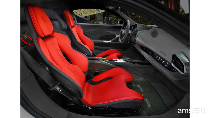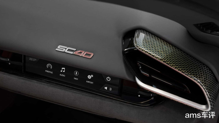 在座舱内部,SC40延续并再现了F40的材料“哲学”。经过改良的碳纤维-凯夫拉(Carbon-Kevlar)材料应用于座椅背后、地垫部分、方向盘以及部分仪表组件。深灰色Alcantara与红色提花科技面料(Jacquard Technofabric)形成对比,座椅头枕上绣有编织的SC40标志与跃马徽标。