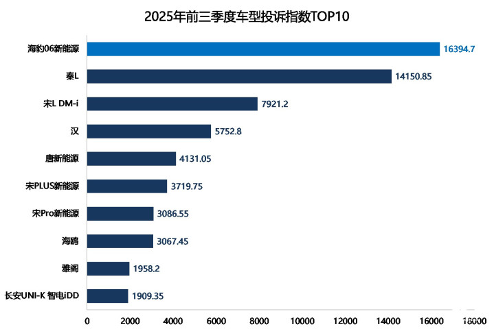 比亚迪整体投诉指数的“鹤立鸡群”也体现在了车型投诉榜上。榜单TOP10中,比亚迪包揽了前八,年初比亚迪推出智驾版引发了比亚迪多款车型老车主的不满。如潮的降价增配投诉声背后,比亚迪多款车型的其他问题也遭到了部分车主的集中投诉。海豹06新能源、秦L、汉续航里程不准,唐新能源、宋PLUS新能源和宋Pro新能源发动机异常启动和配置与官宣不符等问题都成了车主的投诉对象。